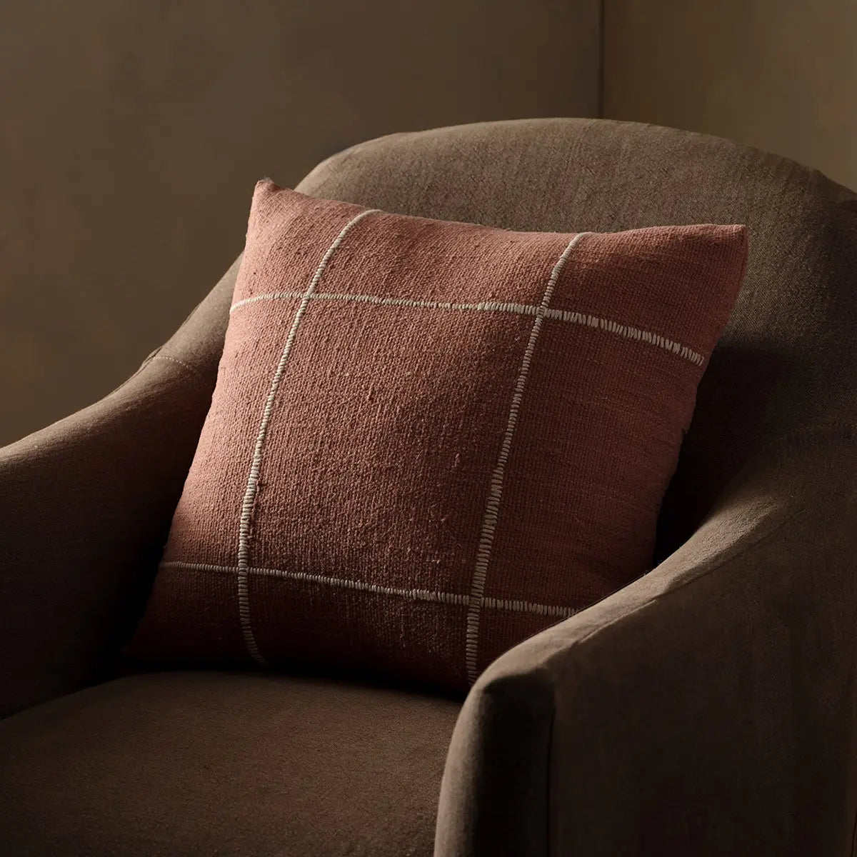 Neem & Jaipur Living present the Margosa collection, offering stonewashed and embroidered handcrafted throws, blankets, and bedding expertly crafted of soft cotton and hand-spun wool in India. Grounded in ancient textile traditions, this collection brings natural designs and textures through indigenous techniques, nature-inspired colors, and raw fibers. The 100% wool Najma pillow features a textured, solid, terracotta orange pattern and is crafted from 100% cotton with a solid brown design, accented by a white stripe for a striking focal point. Its square shape and subtle texture make it a versatile accent.