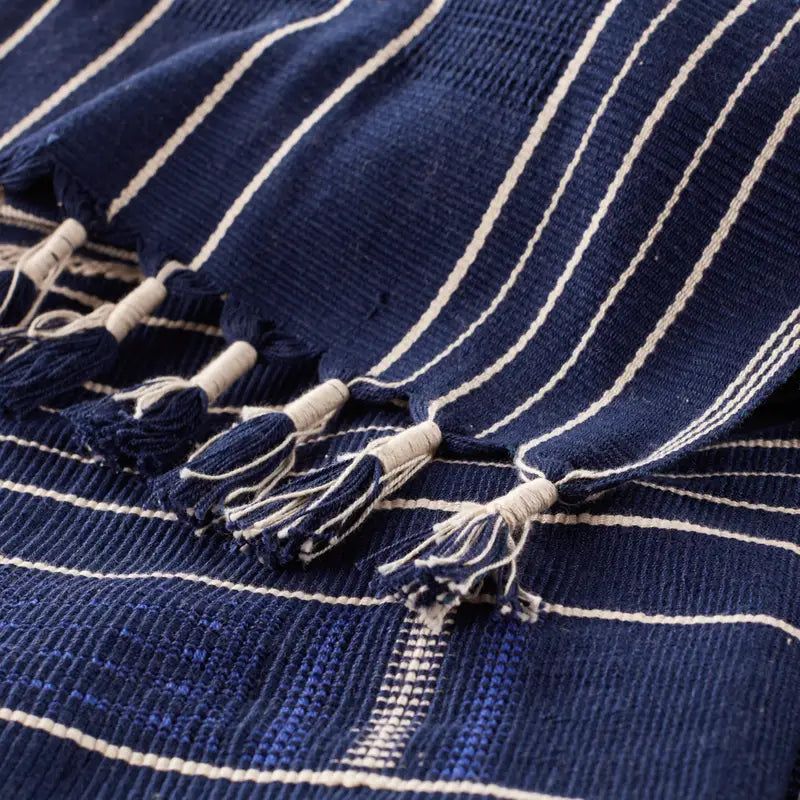 Handmade by weavers in Nagaland, India, the Nagaland collection showcases the traditional loin-loom techniques of the indigenous tribes of the region. The artisan-made Imena throw effortlessly combines heritage-rich tribal patterns with a versatile, contemporary colorway of royal blue and ivory for a stunning statement in any space. Crafted of soft, finely woven cotton, this classic blanket brings the global art of Naga textiles to the modern home.