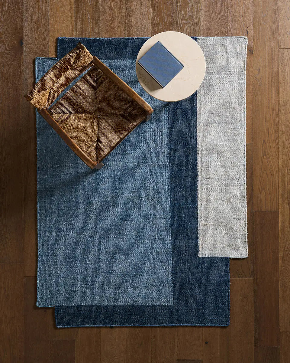 The Badal design from the Refined Layers collection presents a modern architectural statement through its compelling color block palette. Handcrafted from natural jute, its beautifully textured dhurrie pile showcases layered geometric forms in a sophisticated Blue pallete.